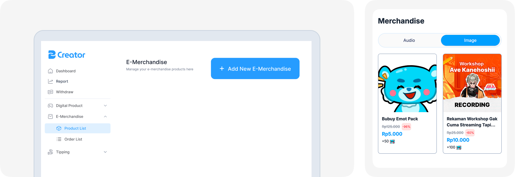 Creators can sell digital merchandise such as audio, images, e-books, and other digital products through their platform. This feature allows creators to fully customize their e-merch catalogue, including setting standard prices and promotional pricing.